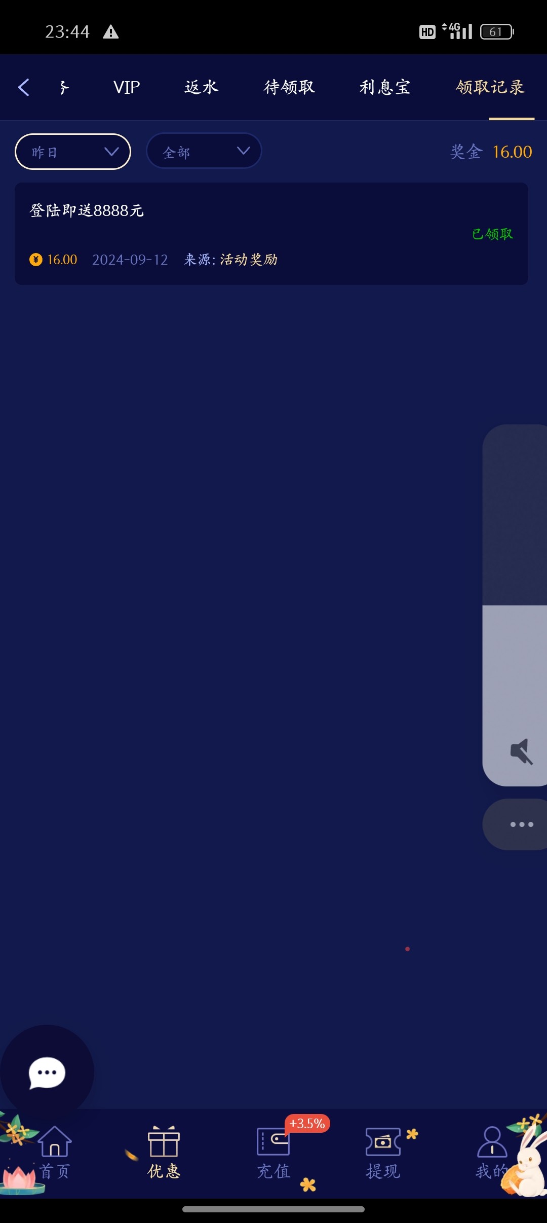 9月12号之前注册登录账号就有,提现得充值同等金额打够流水可提现!