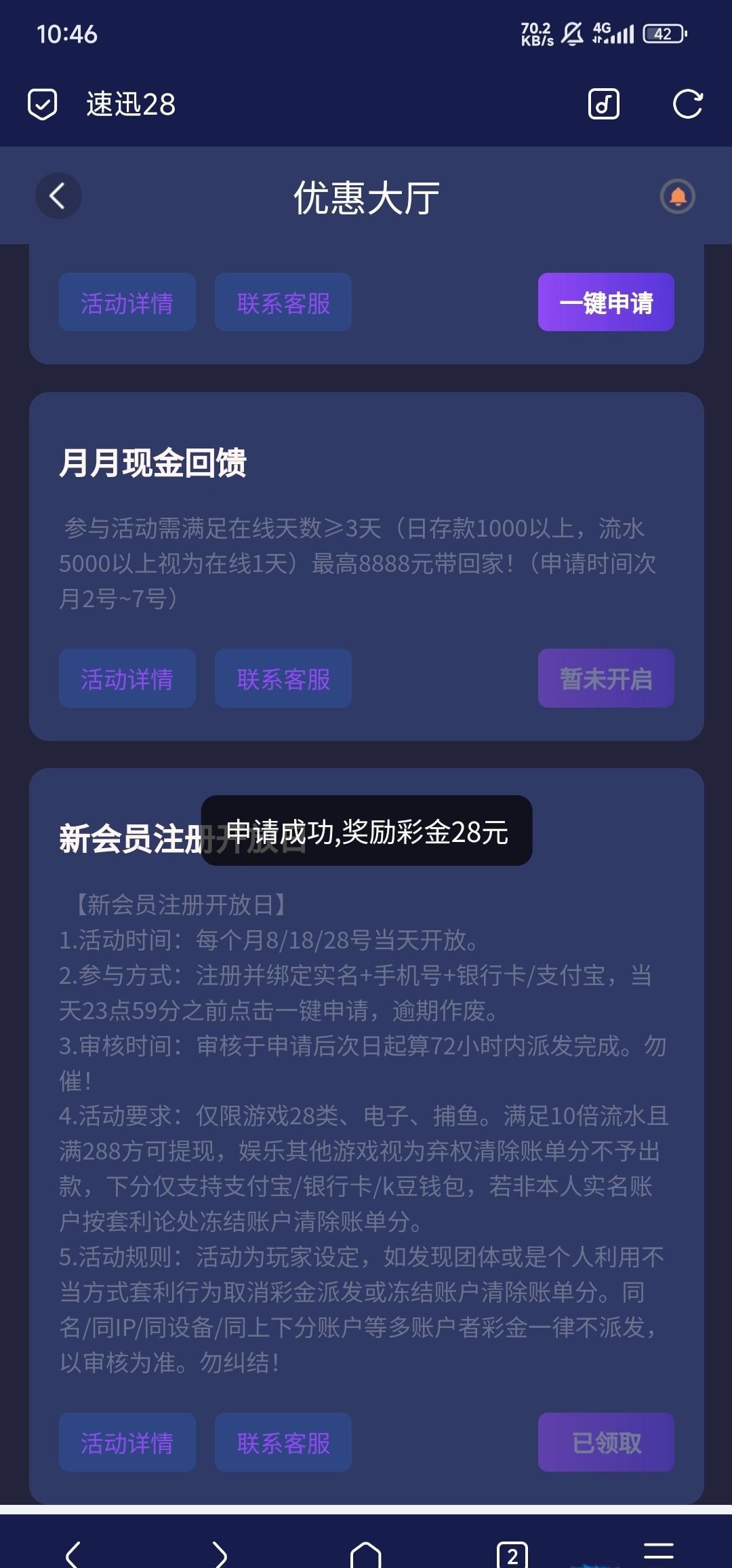 每月8~18号~28号。注册的新用户即可申请28,绑定基本信息,在优惠中心一键申请,审核会比较久这个链接sx999.vip