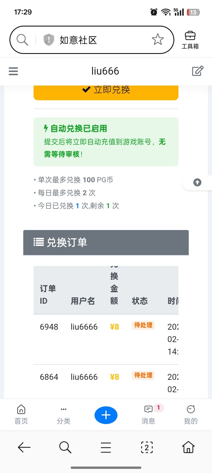 1.兑换:社区币按2:1比例兑换为PG币,每次在社区个人中心积分里面兑换。