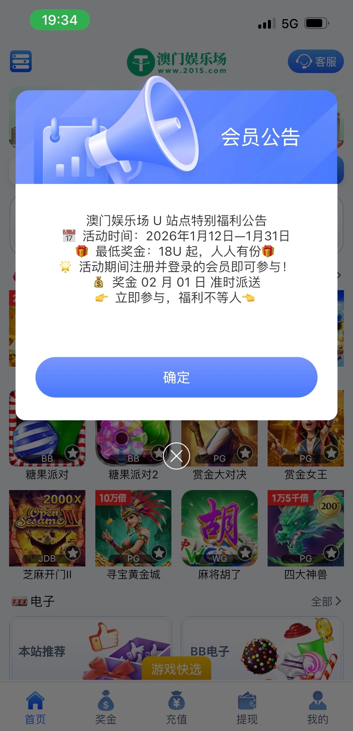这应该就是活动公告上2.1送18的那个活动了,我一个号很早就注册了这几天充了30u送了,另一个号昨天注册的没充没给,老哥们最近有充值的可以上号看看链接2015.com