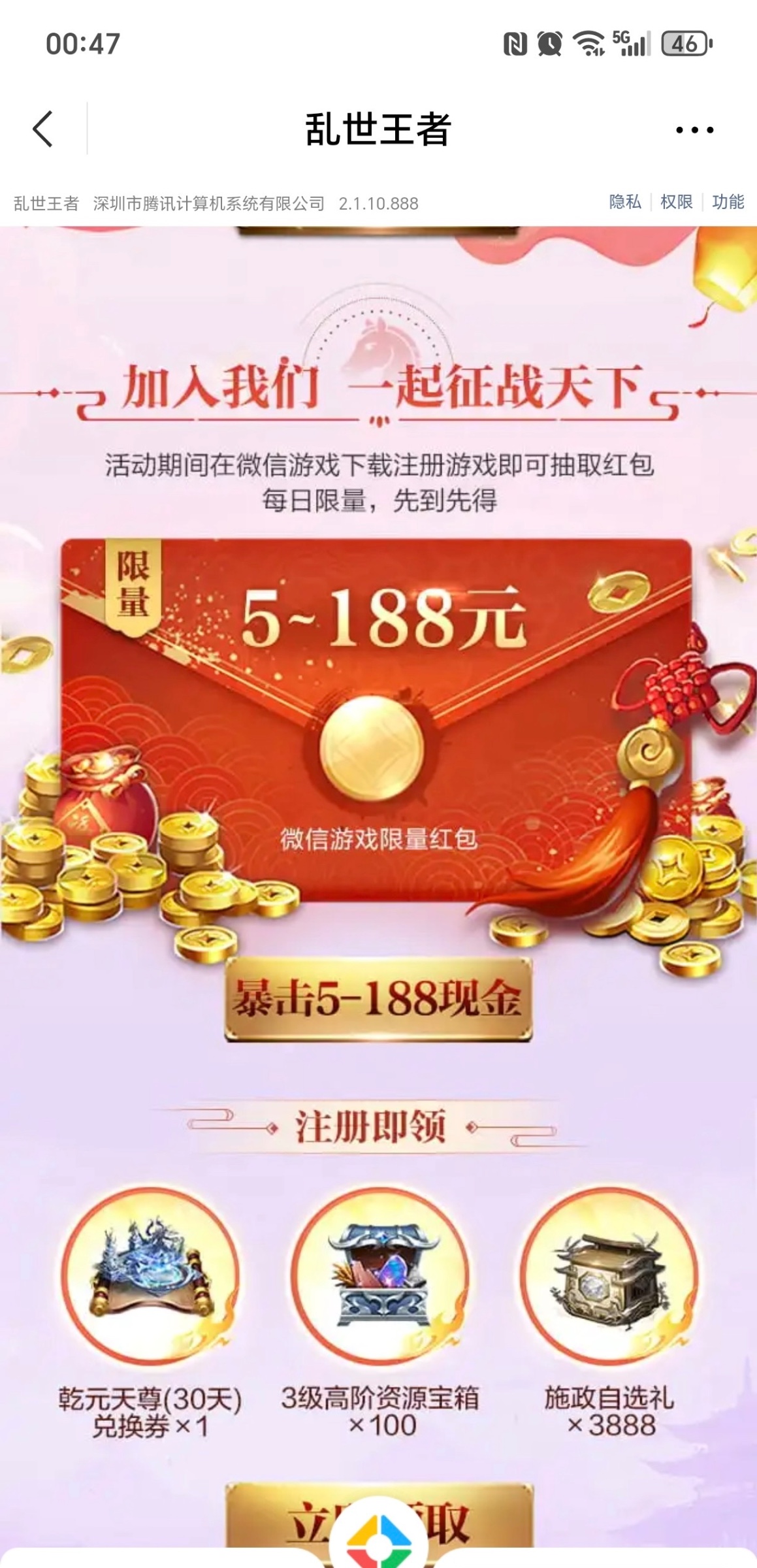 不废话步骤上图,微信游戏中心搜索乱世王者,下载注册不用玩送5块微信红包,记得领一个v删除游戏,重新下,多v多噜,可以单设备无限切换,我撸了16个v